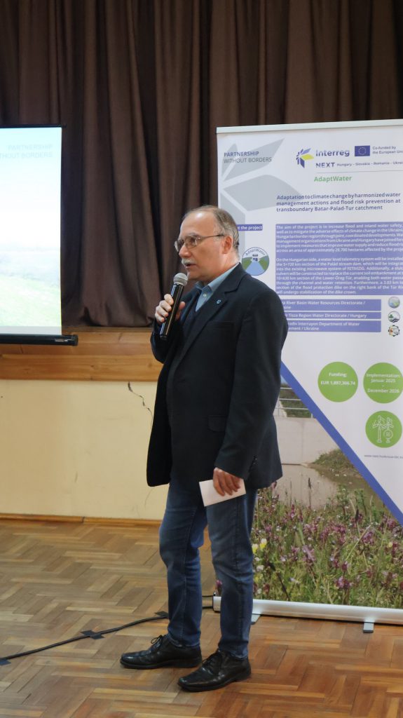 Під час форуму Дюла Філеп, координатор проєкту в Угорщині, начальник Сотмарської інженерної дільниці Верхнє-Тисайської Дирекції водного господарства детально розповів учасникам заходу про передумови проєкту AdaptWater, а також рішення, запропоновані проєктом на території громади для покращення управління водними ресурсами, вирішення проблем затоплення і нестачі води на території Батарської транскордонної водогосподарської системи. Крім цього, Іштван Дойко, начальник відділу протипаводкового захисту і управління річок FETIVIZIG у своєму виступі звернув увагу на тісне співробітництво водників України та Угорщини у питаннях захисту від шкідливої дії вод.