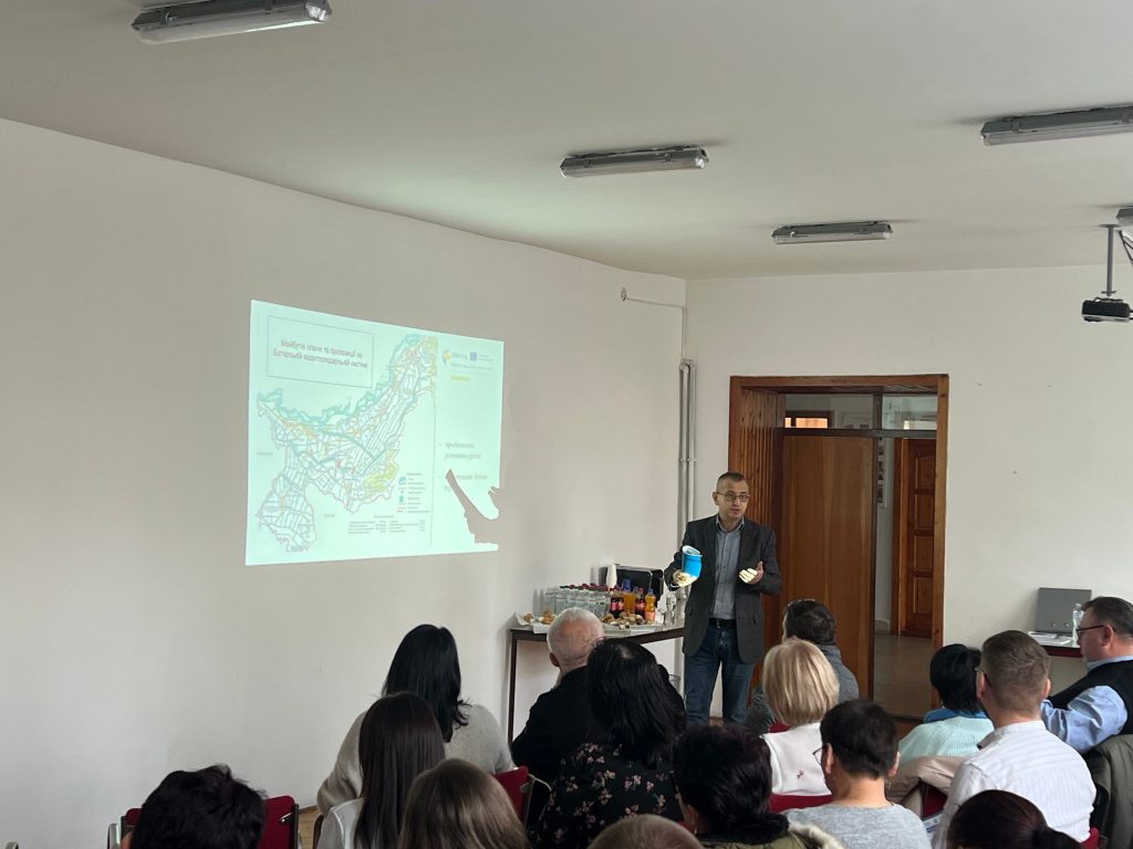 Під час зустрічі координатор партнера Виноградівського МУВГ Євген Кедик у презентаційному виступі розповів про особливості Батарської транскордонної водогосподарської системи, історичне значення і становлення, взаємозв’язок з угорською частиною системи, важливість узгодженого управління водними ресурсами з сусідньою країною. Ознайомив присутніх із метою та заходами проєкту AdaptWater, які є логічним продовженням спільних українсько-угорських планів розвитку Батарської водогосподарської системи. Наразі, на території системи проходить реалізація основного заходу проєкту в Україні, здійснення реконструкції каналу Старий Батар довжиною 5,5 км біля с.Неветленфолу – с.Дюла, і наступного року передбачена реконструкція розподільчого шлюза-регулятора на каналі Старий Батар. Вже зараз, внаслідок здійснених робіт з розчистки каналу збільшено його пропускну здатність і канал може провести додатковий об’єм паводкових вод. У межах проєкту закуплено також техніку для належної експлуатації об’єктів водогосподарської системи.